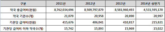 약국간이 경영 격차는 건강보험심사평가원의 ‘약제비 상위 청구 약국 현황’ 자료와 비교해 보면 더욱 극명하게 나타난다. 2013년 급여비를 가장 많이 받은 약국이 334억93백만원대로 평균급여비 4억11백만원보다 무려 81배의 차이를 나타냈다.