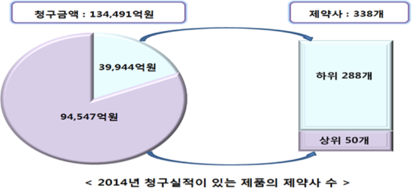 최근 5년간(2010∼2014) 건강보험 청구의약품 시장 변동에 대해 분석한 결과, 2014년 기준 상위 50개 제약사가 전체 금액의 70.3%를 차지하는 등 상위제약사 집중도가 매우 높게 나타났다.