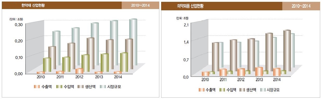 한약재 생산액은 0.186조원으로 전년대비 1.97% 증가했으며, 수출액은 0.013조원으로 전년대비 4.24%, 수입액은 0.129조원으로 전년대비 5.07% 증가했다.