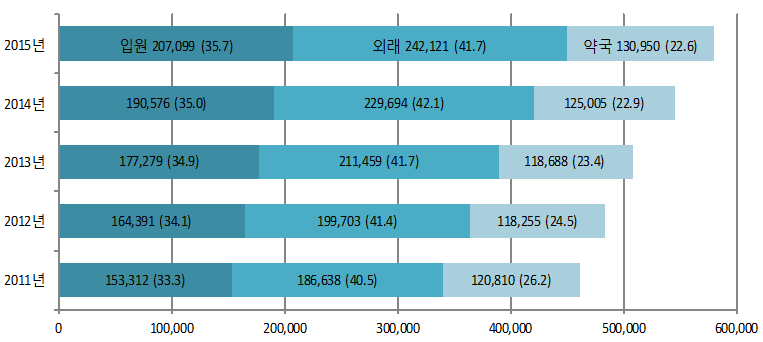2015년 의료기관 종별 진료비는 의원 11조 7,916억원, 병원 9조 7,376억원, 상급종합병원 9조 1,596억원 순이며, 전년 대비 증가율은 치과병원 25.0%, 치과의원 18.2%, 한방병원 17.6%, 요양병원 12.4% 순이다.