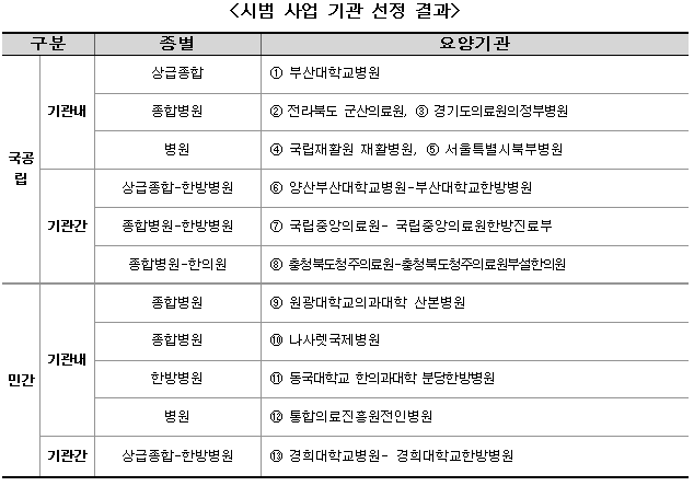 시범사업 관리를 맡은 심사평가원(원장 손명세)이 지난 6월 15부터 21일까지 시범사업 기관을 공모한 결과, 전국에서 총 44개 기관이 응모를 하였으며, 응모한 전체 국‧공립병원 8개와 의과·한의과간 협력진료 건수 등이 많은 민간병원 5개가 선정됐다.