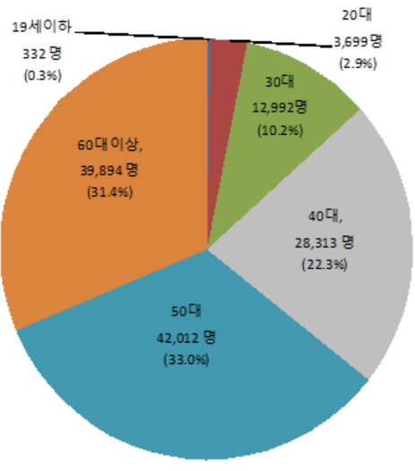 2015년 기준으로 50대(42,012명, 33.0%)가 가장 많았고, 그 다음으로 60대 이상(39,894명, 31.4%), 40대(28,313명, 22.3%), 30대(12,992명, 10.2%) 순으로 순으로 나타났다.