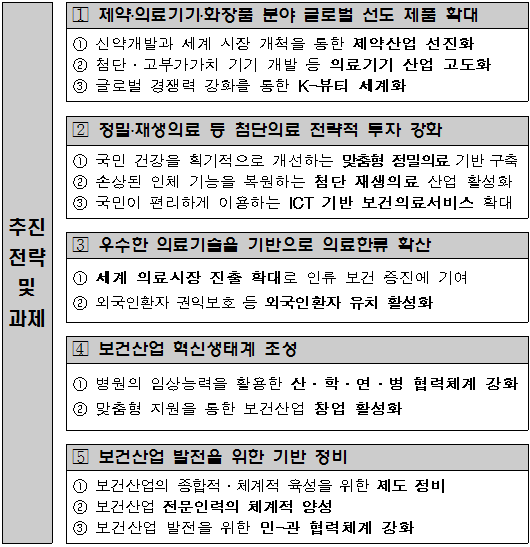 앞으로 5년간 보건산업을 집중 육성하여 수출은 2015년도 9조원에서 2020년까지 20조원으로, 일자리는 2015년도 76만명에서 2020년까지 94만명으로 확대한다는 전략이 발표했다.