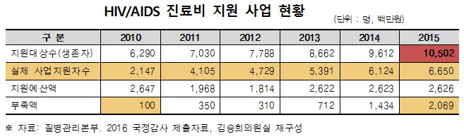 뿐만아니라, 2015년 HIV/AIDS 환자 실제 생존자 수는 10,502명이지만, 요양기관에서 치료 받은 환자 수는 9,773명으로 729명의 생존자가 치료 받지 않고 있는 것으로 나타났다.
