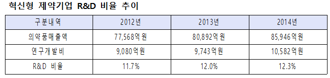 혁신형 제약기업의 의약품 매출액 대비 연구개발비 비중은 2012년 의약품매출액 7조7,568억원 중 연구개발비가 11.7%인 9,80억원, 2013년 매출액 8조892억원 중 연구개발비가 12.0%인 9,743억원, 2014년 매출액 8조5,946억원 중 연구개발비가 12.3%인 1조 582억원으로 나타났다.