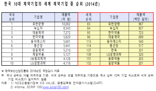 보건산업진흥원이 남인순 더불어민주당 의원에 국정감사 자료로 제출한 ‘한국 10대 제약기업의 세계 제약기업 중 순위’에 따르면, 2014년도 기준으로 유한양행 83위, 녹십자 84위, 대웅제약 95위, 한미약품 96위 등 4개 제약기업이 세계 100대 제약기업에 포함되는 것으로 분석되었다.