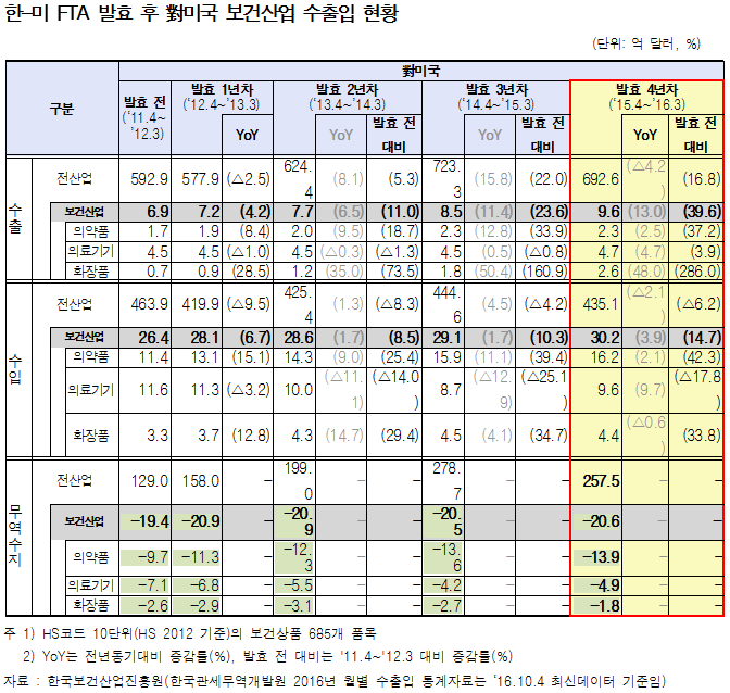 남인순 더불어민주당 의원에 보건산업진흥원이 제출한 ‘한·미 FTA 발효 후 對미국 보건산업 수출입 현황’에 따르면, 對미국 보건산업 수출은 발효 전(2011.4~2012.3) 6.9억 달러에서 발효 4년차(2015.4~2016.3) 9.6억 달러로 39.6% 증가한 것으로 나타났으며, 수입은 발효 전 26.4억 달러에서 발효 4년차 30.2억원으로 14.7% 증가한 것으로 나타났다.