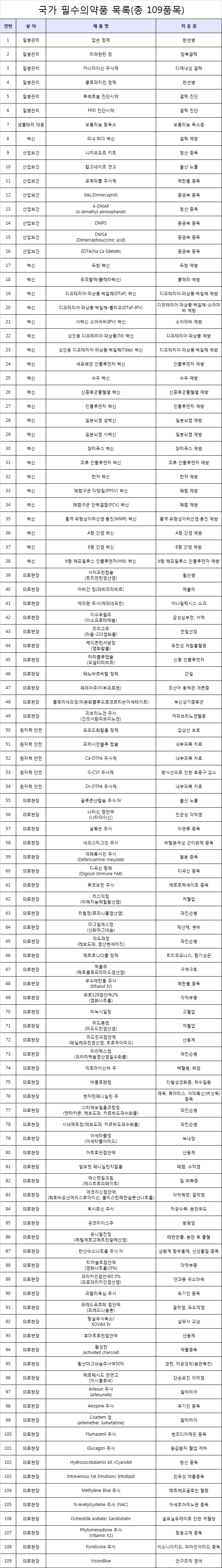 이번에 지정되는 109개 품목은 공급방법 별로는 '국가비축용 의약품' 36품목과 '공급중단 시 지원 의약품' 73품목으로 나뉜다. 향후 정부기관, 전문가, 제약업계 등 의견과 국가필수의약품 사용현황, 국내·외 보건상황 등을 고려하여 지정 품목은 변경해 나갈 계획이다.