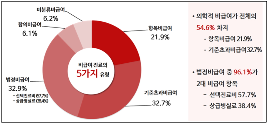항목비급여(의학적비급여①), 기준초과 비급여(의학적비급여②), 법정비급여, 합의비급여, 미분류 비급여 등이다.