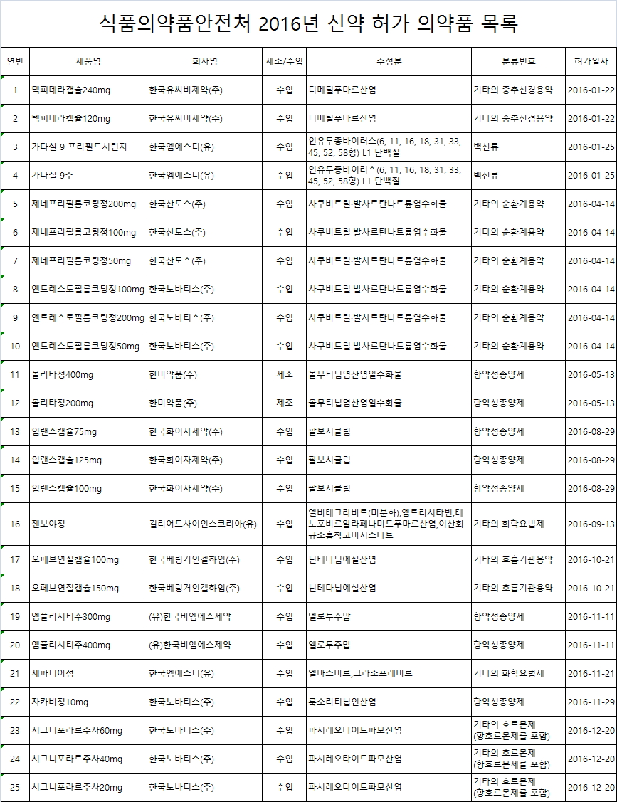 회사별로는 한국노바티스가 항악성종양제 '자카비카정10mg' 등 7품목으로 가장 많은 제품을 허가받았고, 한국산도스 한국화이자제약 한국엠스디 등이 각각 3품목의 허가를 받은 것으로 집계됐다.