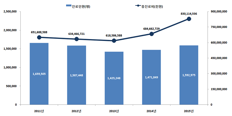 2015년 입원환자 1인당 평균 진료비용은 약 182만원으로 2011년 대비 약 36만원 증가하였으며, 외래환자의 1인당 평균 진료비용은 약 6만원으로 최근 5년간 큰 차이가 없는 것으로 나타났다.