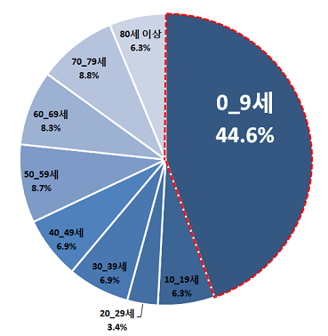 2015년 진료인원의 연령구간별 비중은 0-9세가 44.6%로 가장 높았고, 20대가 3.4%로 가장 낮았다. 다른 연령구간은 6~8%로 비슷한 비중을 차지했다.