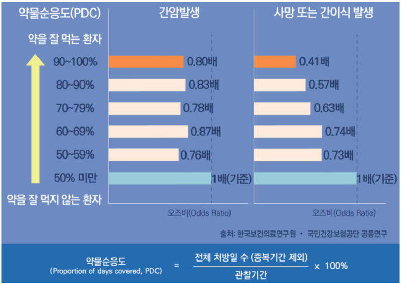 그 결과, 매일 복용해야 하는 약을 90% 이상으로 철저히 복용한 환자들이 50% 미만으로 복용한 경우에 비해서 사망이나 간이식 위험은 59% 감소하고, 간암 위험도는 20% 감소한 것으로 나타났다.