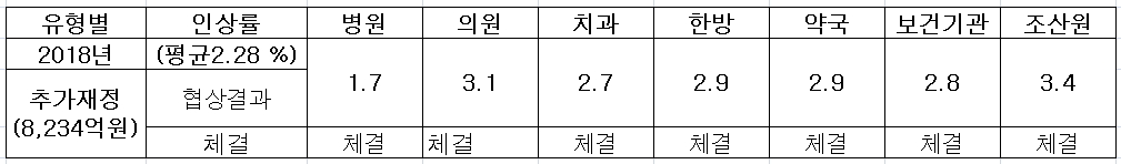 2018년 평균 수가 인상률은 2.28%로 전년대비 0.09%(2017년 평균 인상률 2.37%) 높아졌으며 추가소요재정은 8,234억원으로 지난해 8,134억원에 비해 100억원이 증가했다.