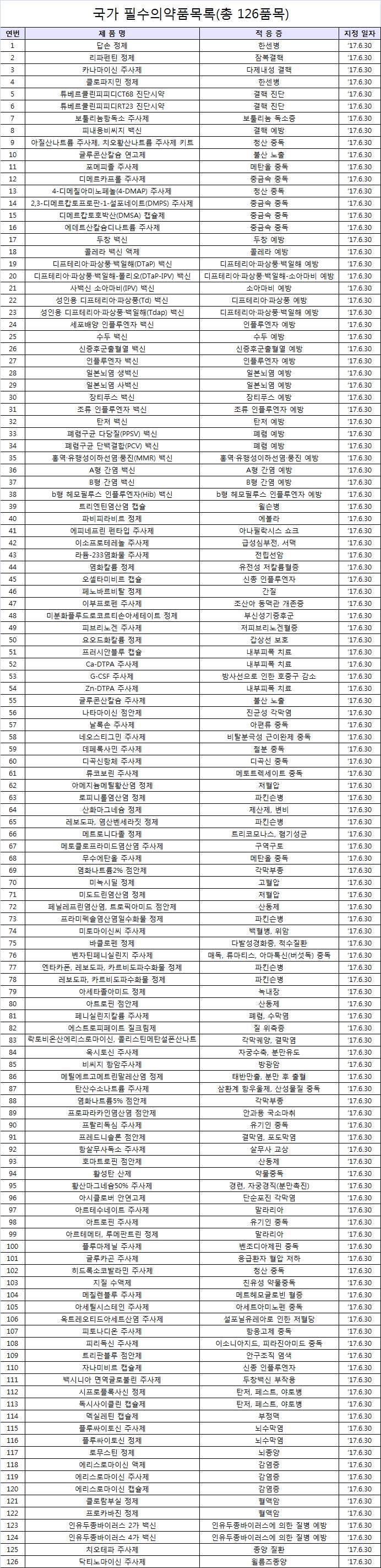 현재 ‘국가필수의약품’ 126개 제품은 필수예방접종 백신 20개 등 정부 정책목적 상 필수적인 의약품 71개과 응급 의료 상 필요한 해독제 21개 등 의료현장에서 필수적인 의약품 55개다.