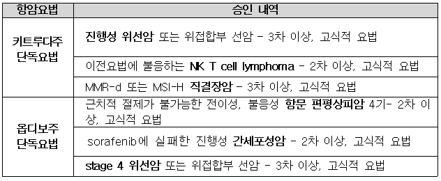 이번 논의 주요사항은 ▲옵디보주 단독요법에 위암, 간세포암, 항문암 등 3개 요법 ▲ 키트루다주 단독요법에 위암, 비호지킨림프종, 직결장암등 3개 요법이 승인됐다.