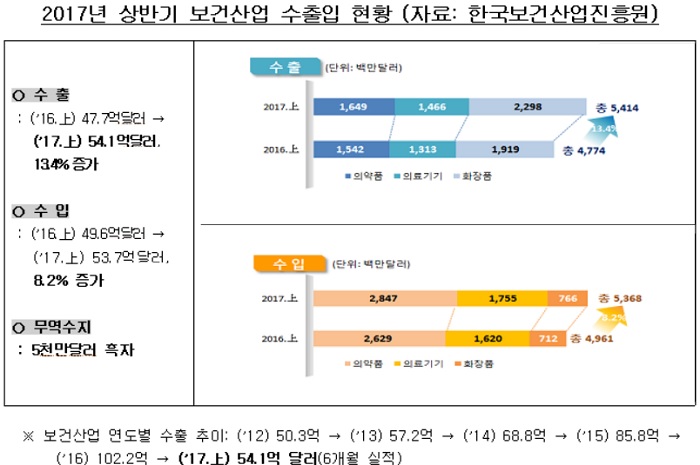 보건산업 수출은 지속적으로 성장해 2012년 50억달러에서 2016년에는 102억달러로 2배로 늘었으며, 올해 상반기에도 성장세가 이어졌다. 분야별 수출도 모두 늘어, 각각 전년 동기 대비 의약품 6.9%, 의료기기 11.7%, 화장품 19.8% 수출액이 증가했다.