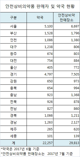 안전상비의약품 판매업소는 전국적으로는 경기가 7,505개로 가장 많고, 그 뒤는 서울 6,697개, 경남 2,127개, 부산 1,796개, 인천 1,380개, 충남 1,368개, 경북 1,211개 등의 순이었다.