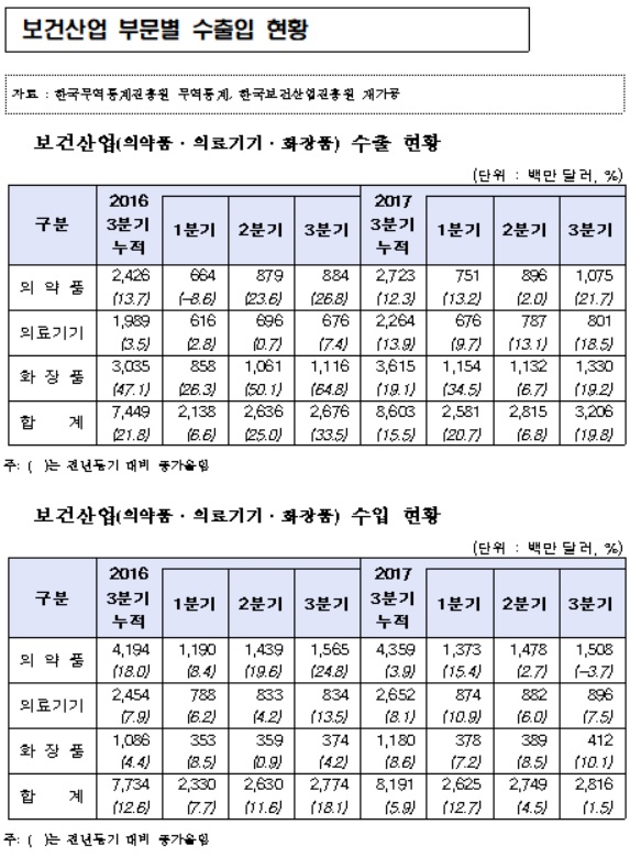 2017년 3분기 실적을 보면, 보건산업(의약품·의료기기·화장품) 총 수출액은 86억 달러(9조7천억원)로 전년 동기대비 15.5% 증가하고, 수입액은 81억9천만 달러(9조3천억원)로 5.9% 증가해 4억달러 흑자를 기록했다.