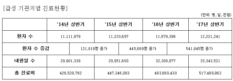 환자들의 병원 내원일수도 크게 증가해 2014년 2,990만일 이었으나, 2017년 상반기에는 3,334만일로 11.5% 증가한 것으로 나타났다. 총 진료비 또한 2014년 4,285억에서 2017년 5,174억으로 20% 넘게 증가했다.
