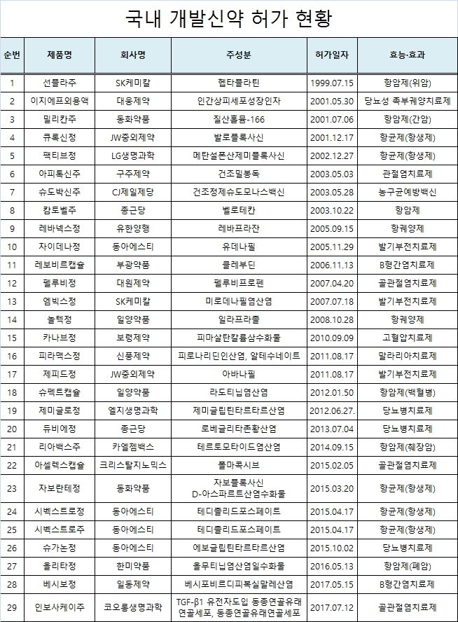 식품의약품안전처에 따르면 2017년말까지 허가받은 국내 신약 29개중 매출 부진과 임상자료 미제출 등으로 생산이 중단된 의약품이 4개로 집계됐다.