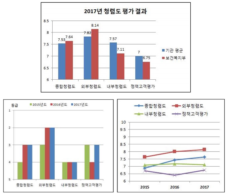 복지부는 2017년 종합청렴도 7.64점으로 평가등급 3등급을 받았는데, 전년(7.43점)대비 0.21점 상승한 수치였다.