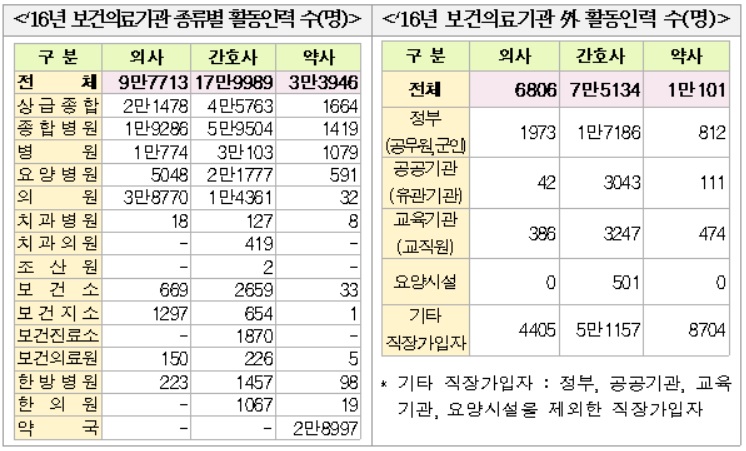 건강보험 직장가입자 자료를 기준으로 추정해 볼 때는 의사 6,800명, 간호사 7만5000명, 약사 1만명이 보건의료기관이 아닌 곳에서 일하는 것으로 보인다.