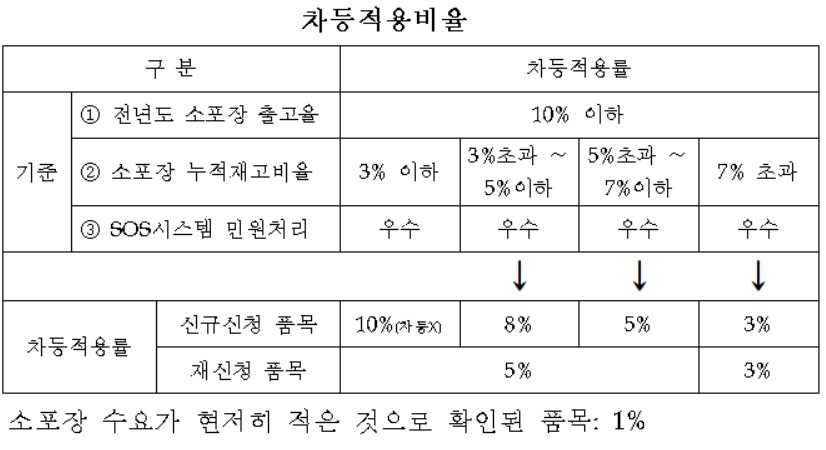차등적용은 전년도 말 소포장 누적재고비율 구간에 따라 정해지는데, 지난해 소포장 출고율이 10% 이하인 의약품 중 소포장 누적재고비율이 3% 초과 5% 이하인 경우 8%, 5% 초과 7% 이하인 경우 5%, 7% 초과인 경우 3%로 각각 차등적용 된다.