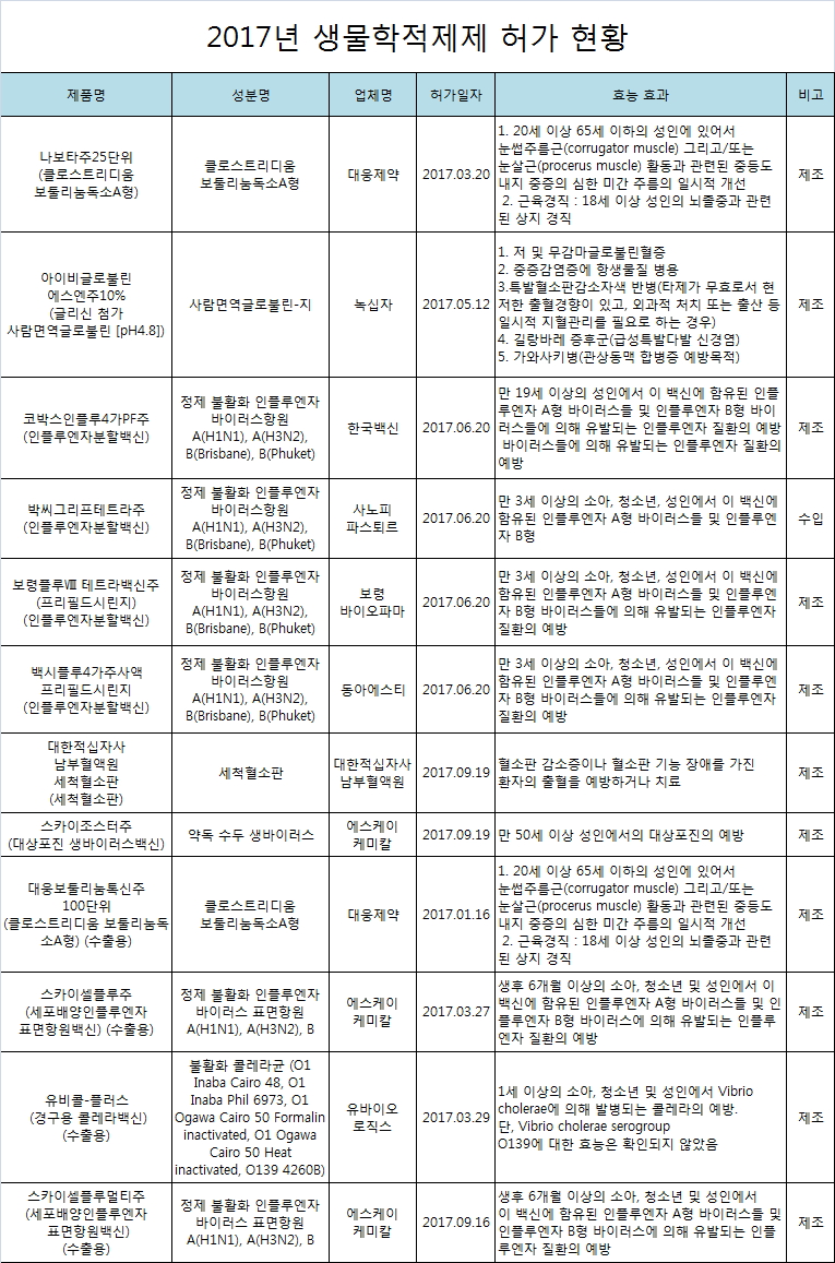 허가된 생물학적 제제로 유형별로 살펴보면 백신 8품목, 보툴리눔 독소 2품목, 혈액제제 2품목 등이었다.