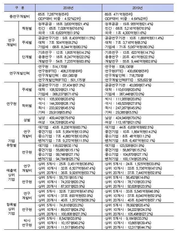 이 자료에 따르면 2019년 우리나라 총연구개발비는 전년 대비 3조3184억원 증가한 89조471억원으로 OECD 국가 중 세계 5위 수준으로 조사됐다. GDP 대비 연구개발비 비중은 전년 대비 0.12%포인트 증가한 4.64%로 세계 2위 수준이다.