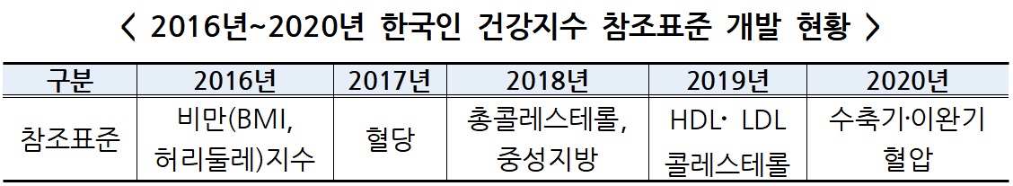 참조표준은 데이터 총괄 평가기준에 따라 유효․검증․인증참조표준으로 등록되며, 한국인 건강지수 참조표준은 모두 ‘유효’참조표준으로 등록됐다.