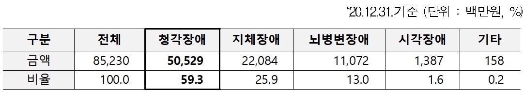 지난해 공단 장애유형별 보조기기 지급현황에 따르면, 청각장애로 인한 보조기기(보청기) 지급금액은 505억원으로 전체 보조기기 지급금액(852억원)의 60%를 차지하고 있다.