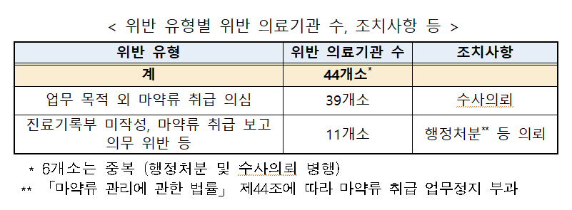 적발된 44개소의 위반 유형은 △오ㆍ남용 처방ㆍ투약 등 업무 목적외 마약류 취급 의심(39개소) △진료기록부 미작성 및 마약류 취급 보고 의무 위반(11개소) 등이다.