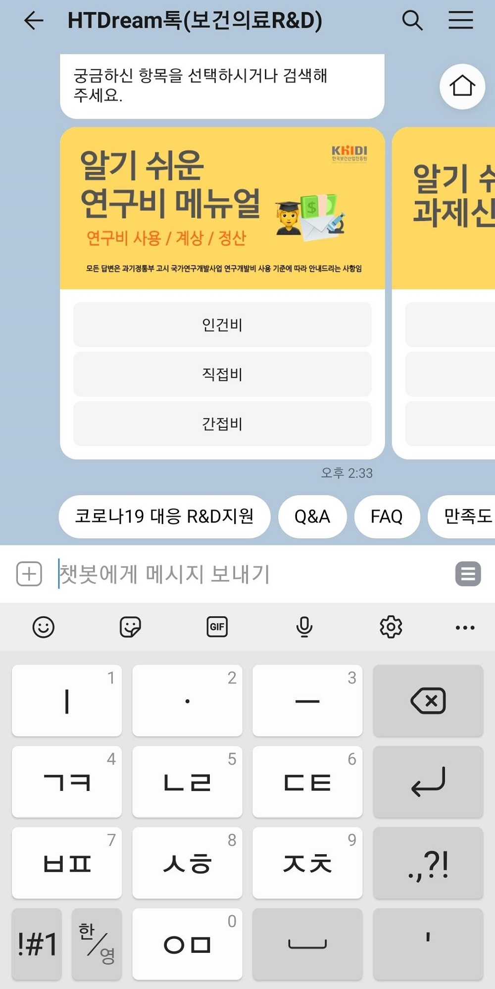 신설된 카카오톡 챗봇서비스는 진흥원 R&D 전문채널인 ‘HTDream톡(보건의료R&D)’을 방문해 사용할 수 있으며, 문의 빈도가 높은 ‘연구비 사용 및 관리’와 관련된 서비스를 고도화해 ‘과제신청 및 평가’ 및 ‘시스템 이용’등과 같은 새로운 분야에 대한 서비스를 추가 제공한다.