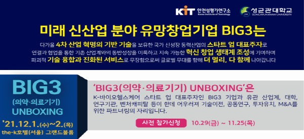 중소벤처기업부가 추진 중인 ‘혁신분야 창업패키지지(BIG3)·멘토링플랫폼운영지원사업(이하 BIG3사업)’의 의약·의료기기 분야 각각의 주관기관인 안전성평가연구소(소장 정은주)와 성균관대학교 산학협력단(단장 박선규)은 오는 12월 1일과 2일 양일간 더케이 호텔(서울) 그랜드 볼룸에서 ‘BIG3(의약·의료기기) UNBOXING’ 행사를 개최한다고 밝혔다.