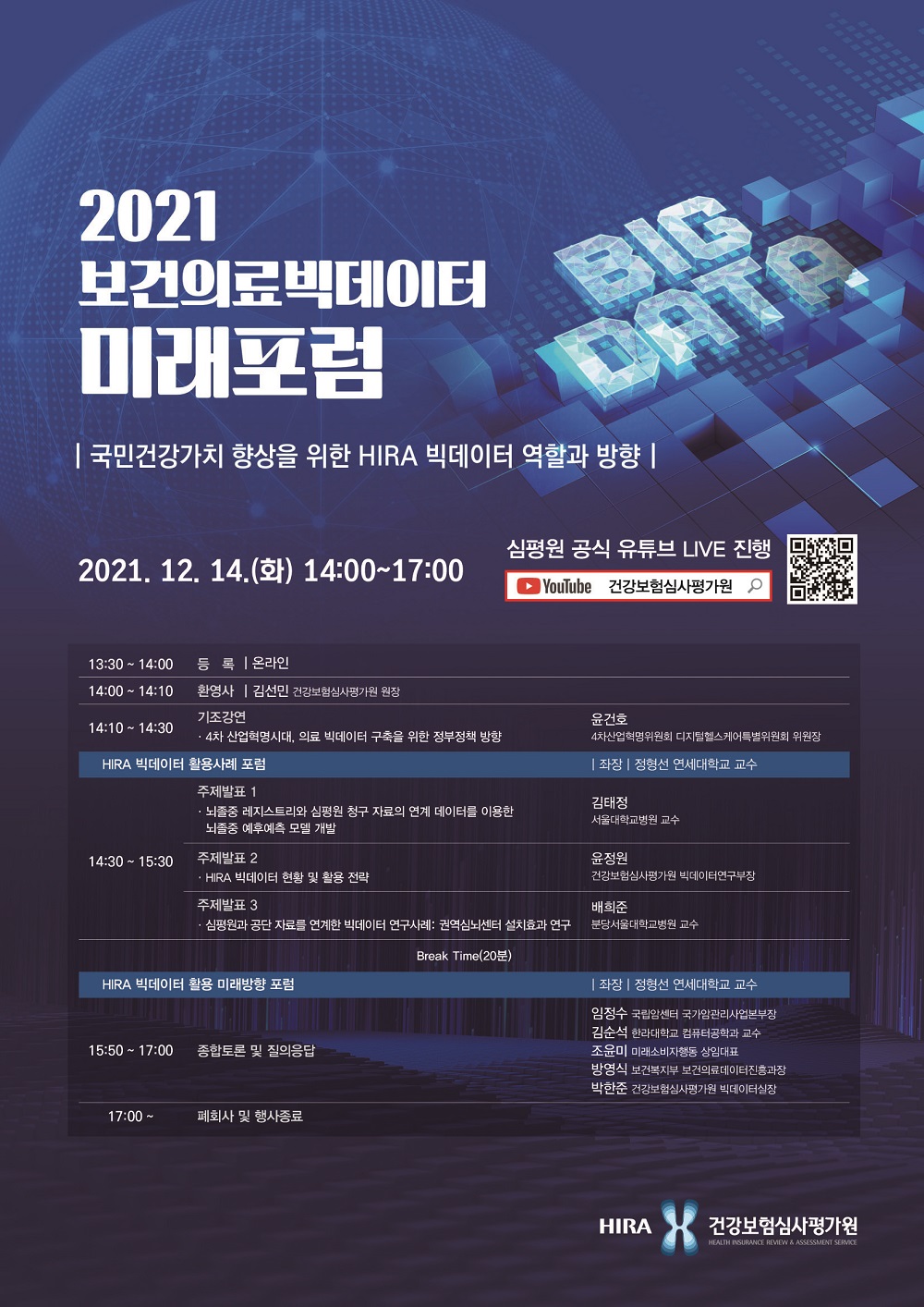 건강보험심사평가원(원장 김선민)은 오는 14일 ‘국민건강가치 향상을 위한 HIRA 빅데이터 역할과 방향’을 주제로 ‘2021 보건의료빅데이터 미래포럼’을 온라인으로 개최한다고 밝혔다.