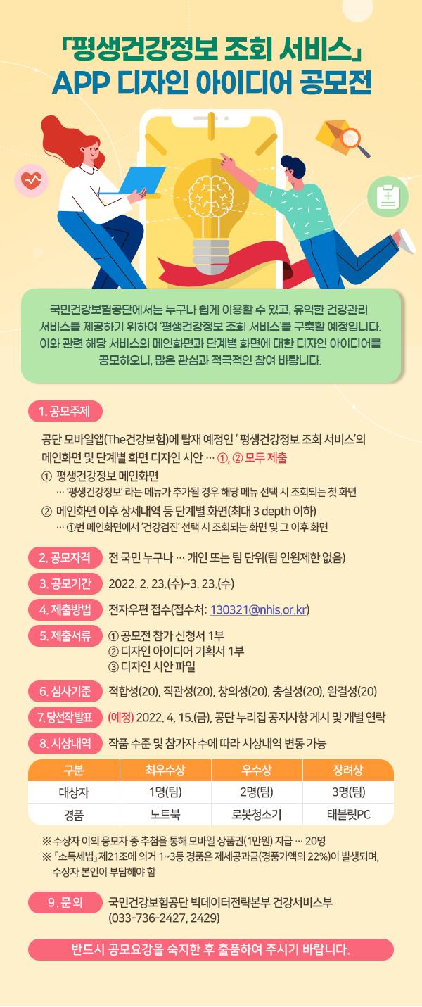 건보공단 관계자는 “새롭게 선보이는 서비스인 만큼 참신하고 감각적인 APP 디자인 아이디어가 응모되길 기대하며, 사용자 경험(UX) 측면에서 편의성이 높은 디자인 아이디어가 접수되기를 바란다”며 “당선작은 추후 모바일앱 내 ‘평생건강정보 조회 서비스’에 적용해 전 국민이 이용 가능하도록 제공할 예정“이라고 밝혔다.