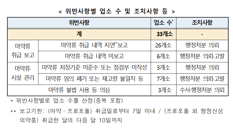 주요 위반사례는 의료기관 등에서 마약류 취급 내역을 보고하지 않거나 늦게 보고한 경우였다.