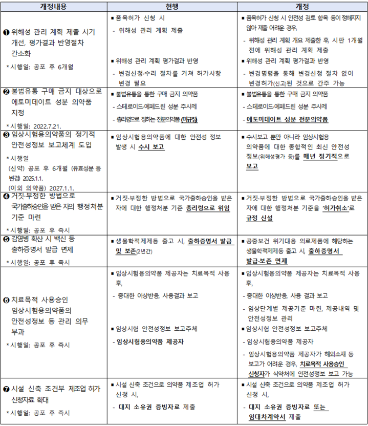 주요 개정내용을 살펴보면, 현행 허가신청 시 위해성 관리 계획을 제출해야 하나, 앞으로는 제출이 어려운 경우 허가신청 시 개요만 우선 제출하고 허가 후 시판 전 1개월 전까지 전체 계획을 제출할 수 있도록 개선한다는 내용이 담겨있다.