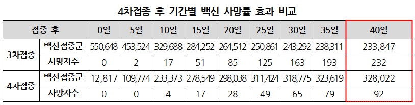 추진단은 이스라엘에서의 3차접종과 4차접종 후 사망률 비교 연구를 통해, 60세 이상 연령층에서 3차접종 완료군과 비교한 결과 4차접종 완료군에서 사망률이 감소한 것으로 확인했다고 전했다.