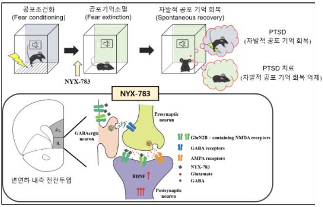 연구진은 외상 후 스트레스 장애 동물 모델에 공포 상황 24시간 후 NYX-783을 주입했으며, 공포기억 재발이 억제됨을 확인했다. 분석 결과 변연하 내측 전전두엽 내 흥분성 신경세포의 GluN2B 소단위체 단백질을 포함한 NMDAS 수용체가 활성화됐다.