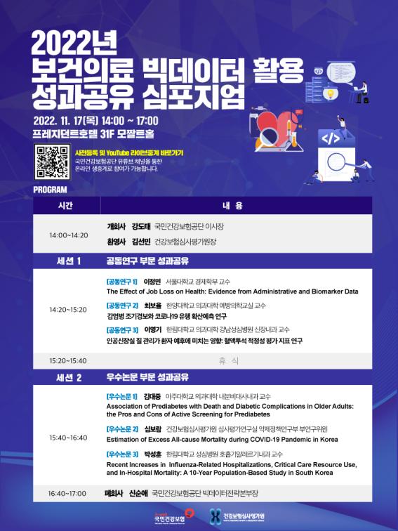 국민건강보험공단(이사장 강도태)과 건강보험심사평가원(원장 김선민)은 17일 오후 2시, 프레지던트 호텔에서 ‘2022년 보건의료 빅데이터 활용 성과공유 심포지엄’을 공동 개최한다고 밝혔다.