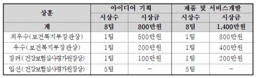 공모한 창업 아이디어 등 아이템을 대상으로 1차 사업계획서 서류심사, 2차 캐주얼 인터뷰, 3차 발표심사를 거쳐 수상작이 선정되고, 최종 발표심사에 진출한 6개 팀에게는 보건복지부장관상(최우수 2팀, 우수 2팀) 및 건강보험심사평가원장상(장려 2팀)이 상금과 함께 지급된다.