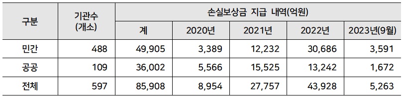 국회 보건복지위원회 소속 더불어민주당 정춘숙 의원이 보건복지부로부터 제출받은 자료에 따르면, 정부는 지난 2020년부터 올해 9월까지 민간 의료기관 488개소를 대상으로 총 4조9900억원의 코로나19 손실보상금을 지급했다.