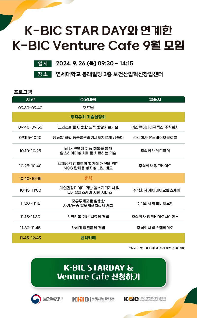 한국보건산업진흥원(원장 차순도)은 오는 26일 서울 연세봉래빌딩 보건산업혁신창업센터에서‘2024년 9월 투자유치 기술설명회(K-BIC STAR DAY) with 벤처카페’를 개최한다고 11일 밝혔다.