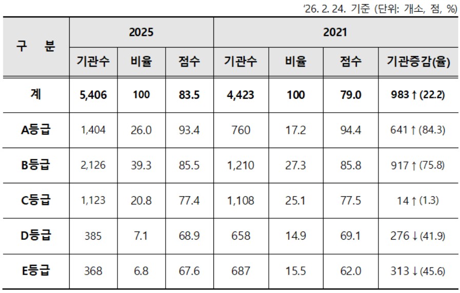 특히 2021년 대비 평가 대상 기관 수가 983개소 증가했음에도 전체 평균 점수는 83.5점으로 4.5점 상승했다. A·B등급 기관은 2021년 1,970개소에서 3,530개소로 1,560개소 증가했으며, E등급 기관은 687개소에서 368개소로 감소했다.
