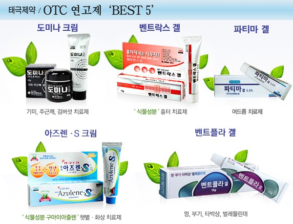 태극제약은 올해 주력 제품으로 도미나크림, 벤트락스 겔, 아즈렌S 연고/크림, 벤트플라겔, 파티마겔 등 5품목을 선정했다.