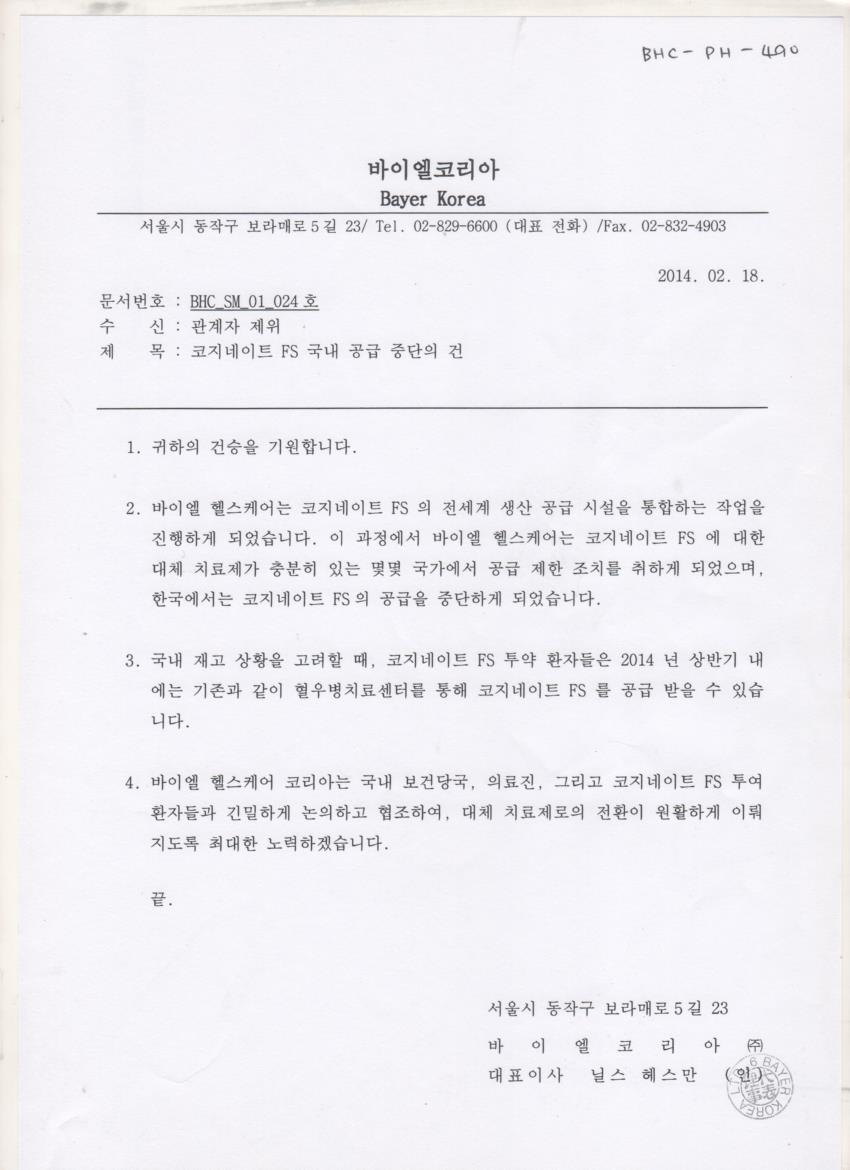 또 "이번 코지네이트-FS 의 공급 중단 사태를 놓고 글로벌 바이엘 본사에서 바이엘 코리아에 대한 내부감사 결과에 따른 조치라는 의혹이 일고 있다."고 피력했다.