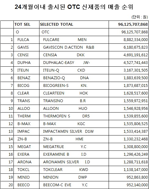최근 24개월 이내 출시된 OTC의약품의 지난해 매출 실적(IMS데이타)에 따르면 한국메나리니의 손발톱무좀치료제 '풀케어'가 88억8천만원으로 매출 1위를 기록했다.