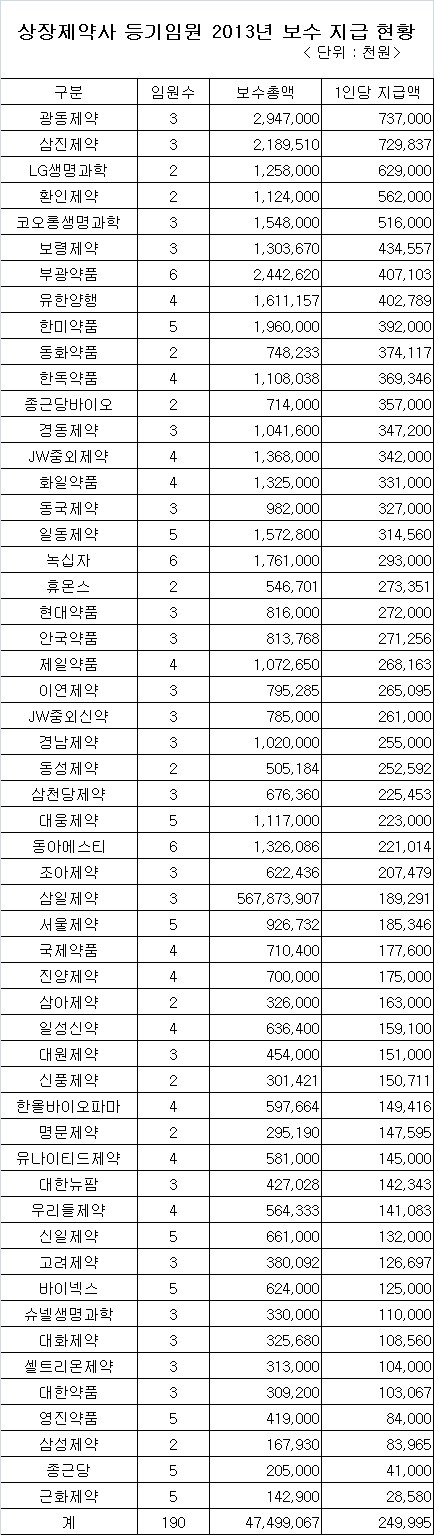 상장제약사 등기임원중 가장 연봉을 많이 많은 인사는 광동제약 창업주인 故최수부 회장은 22억 3,400만원, 부광약품 이성구 前대표이사(퇴임) 16억 9,700여만원, LG생명과학 정일재 대표이사 11억 6,000만원, 보령제약 김은선 대표이사 9억 1,100여만원, 한미약품 임성기 회장 8억 4,600만원 등으로 나타났다.
